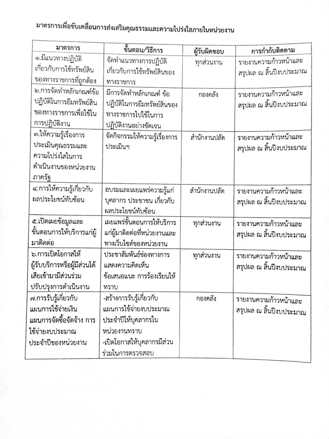 การดำเนินการตามมาตรการส่งเสริมคุณธรรมและความโปร่งใสภายในหน่วยงาน ประจำปี 2565