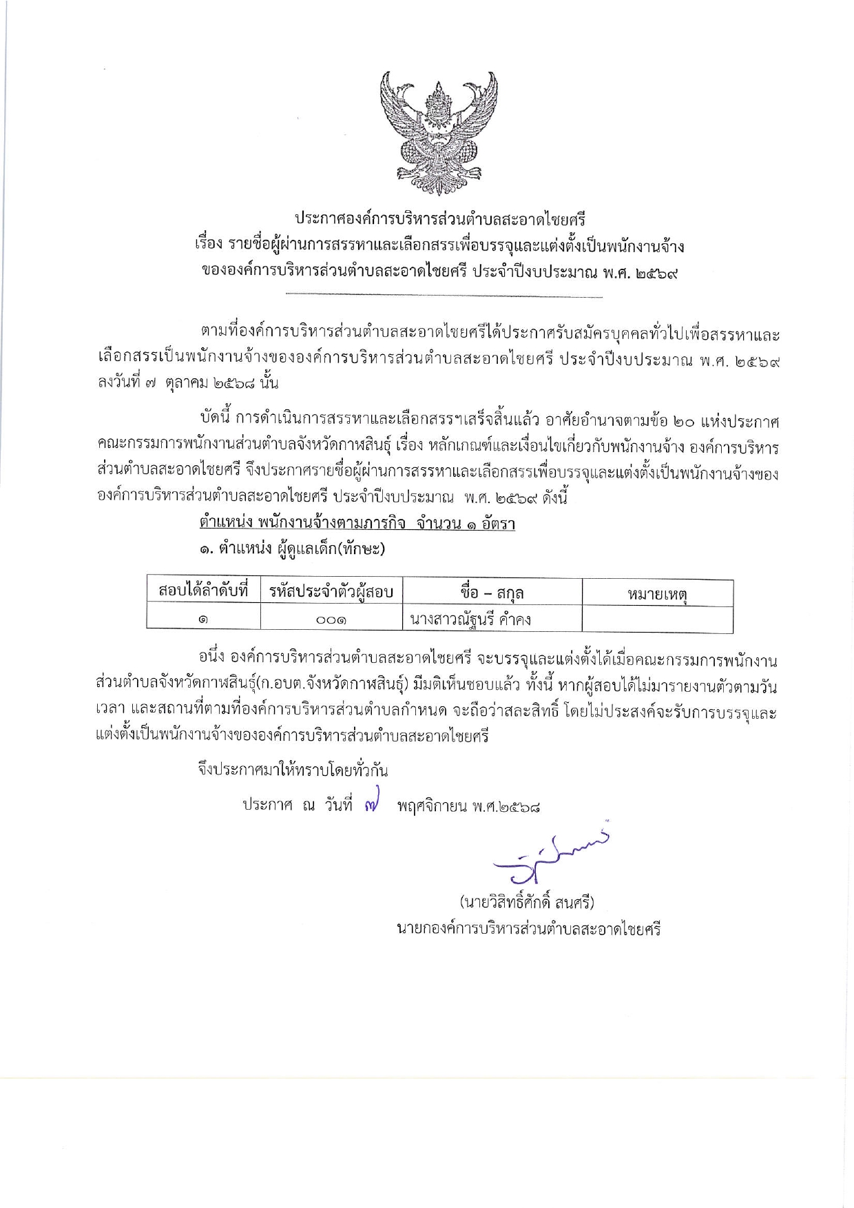 ชื่อเรื่อง : ประกาศรายชื่อผู้ผ่านการสรรหาและเลือกสรรเพื่อบรรจุและแต่งตั้งเป็นพนักงานจ้างขององค์การบริหารส่วนตำบลสะอาดไชยศรี ประจำปีงบประมาณ พ.ศ.2569