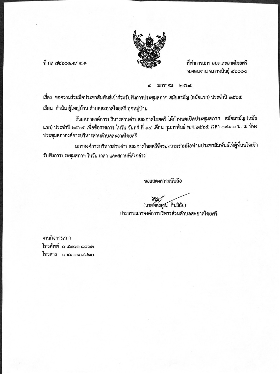 ประชาสัมพันธ์ การประชุมสภาองค์การบริหารส่วนตำบลสะอาดไชยศรี สมัยสามัญ สามัญ (สมัยแรก)
