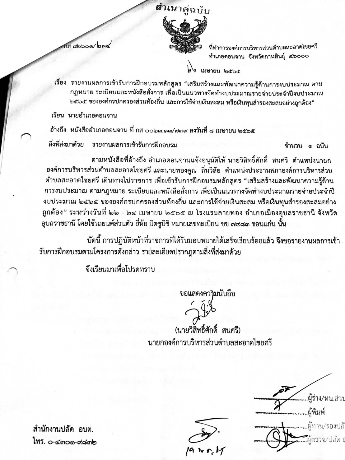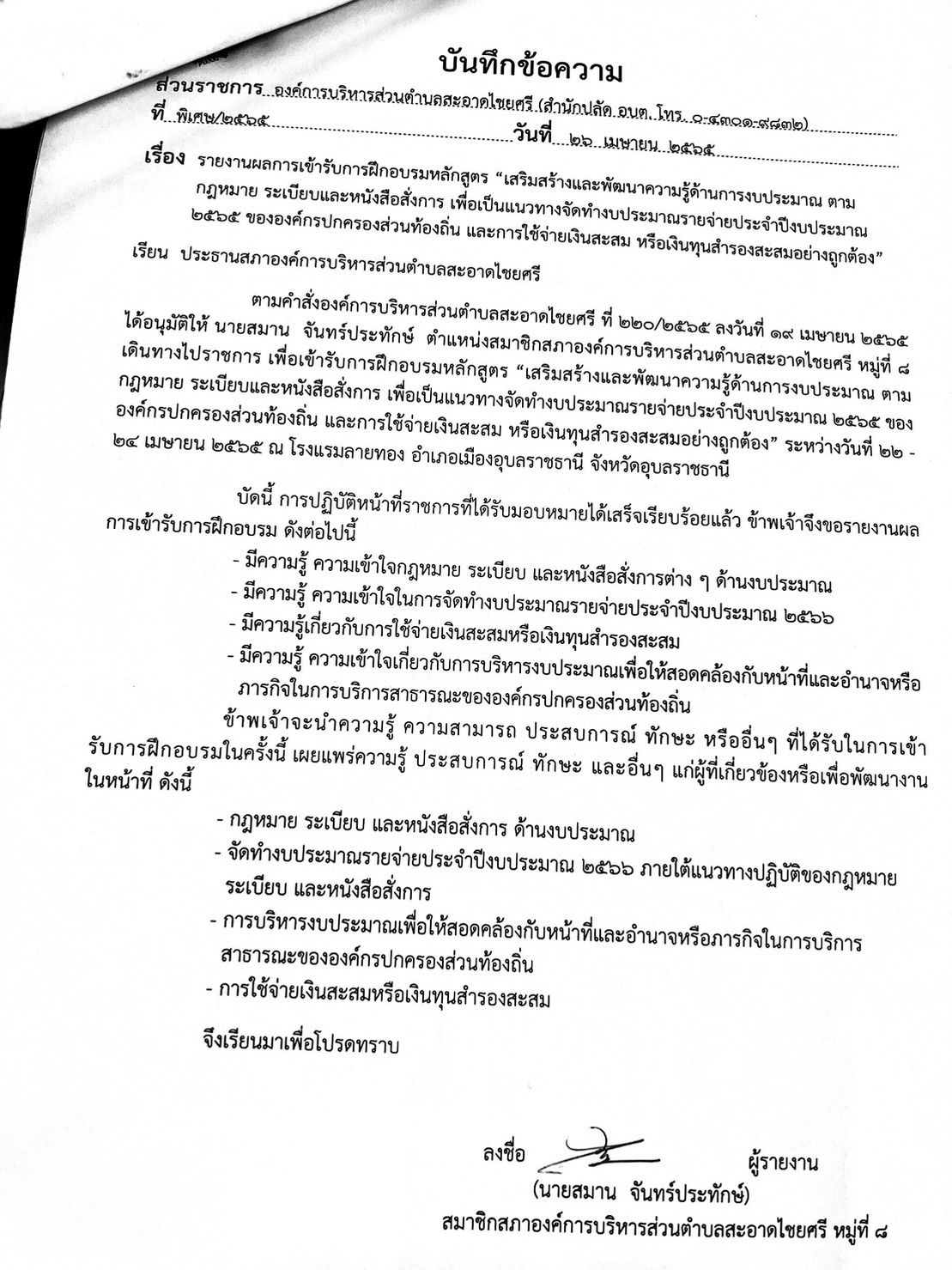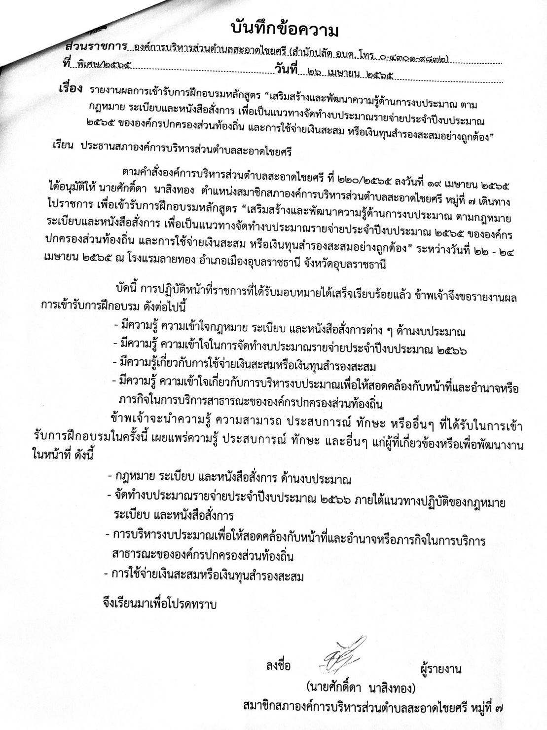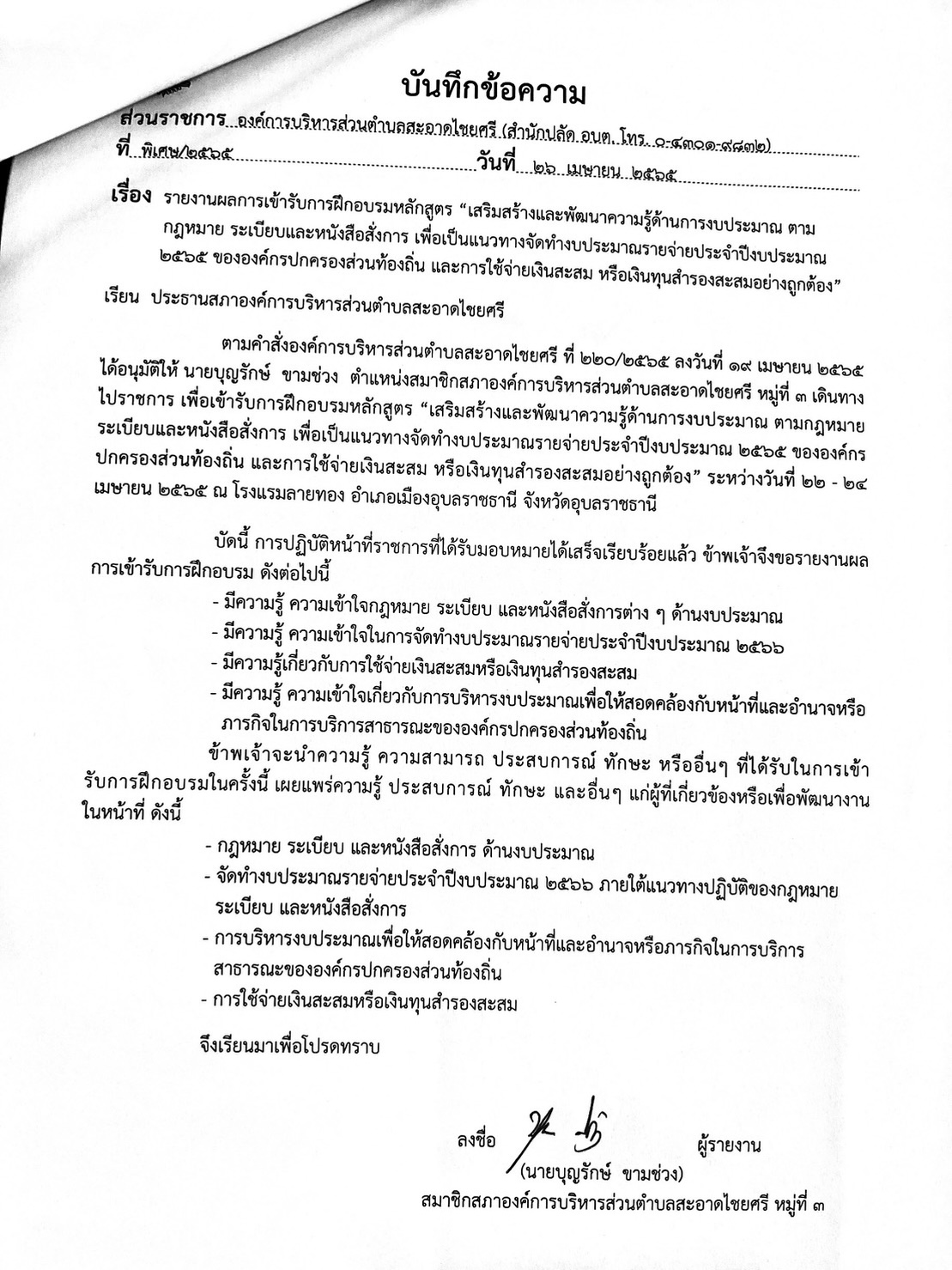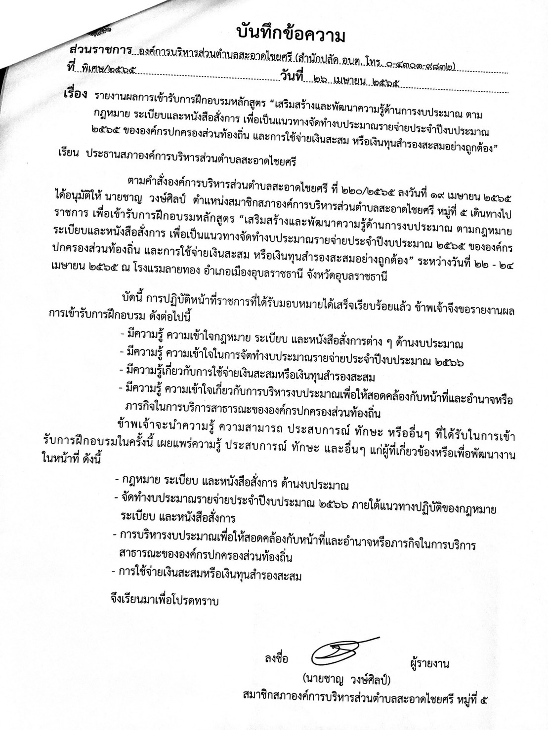 หลักสูตร “เสริมสร้างและพัฒนาความรู้ด้านการงบประมาณขององค์กรปกครองส่วนท้องถิ่นและการใช้จ่ายเงินสะสมหรือเงินทุนสำรองสะสม” ในวันที่ 22 – 24 เมษายน 2565 ณ โรงแรมลายทอง อำเภอเมืองอุบลราชธานี จังหวัดอุบลราชธานี