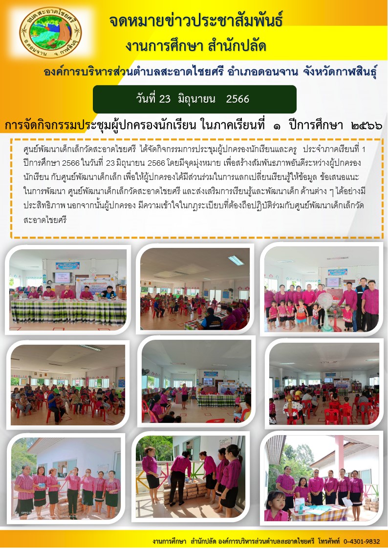 วันที่ 23 มิถุนายน 2566 ศูนย์พัฒนาเด็กเล็กวัดสะอาดไชยศรี ได้จัดกิจกรรมการประชุมผู้ปกครองนักเรียนและครู ประจำภาคเรียนที่ 1 ปีการศึกษา 2566 โดยมีจุดมุ่งหมาย เพื่อสร้างสัมพันธภาพอันดีระหว่างผู้ปกครองและนักเรียน เพื่อให้ผู้ปกครองได้มีส่วนร่วมในการแลกเปลี่ยนเรียนรู้ให้ข้อมูล ข้อเสนอแนะ ในการพัฒนา และส่งเสริมการเรียนรู้และพัฒนาเด็ก ด้านต่างๆ ได้อย่างมีประสิทธิภาพ นอกจากนั้นผู้ปกครองมีความเข้าในกฏระเบียบที่ต้องถือปฏิบัติร่วมกันกับศูนย์พัฒนาเด็กเล็กวัดสะอาดไชยศรี